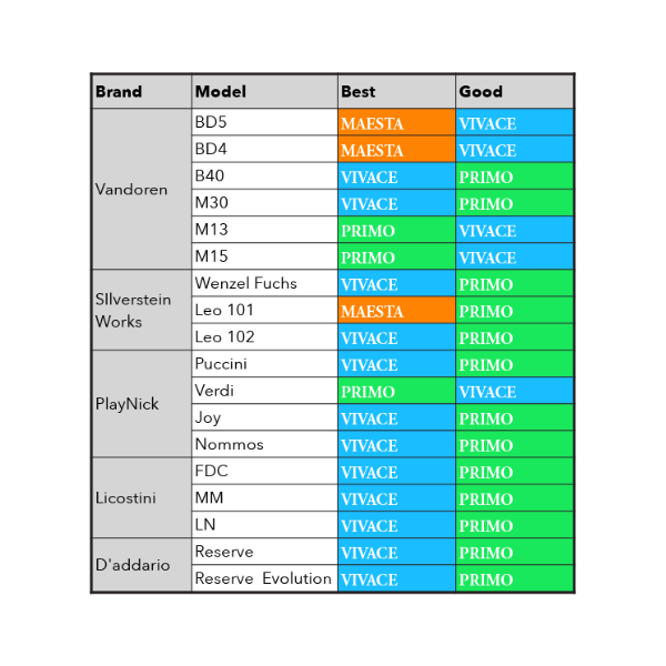- Vivace là lựa chọn hoàn hảo cho những người chơi đã quen chơi dăm kèn tổng hợp. Vivace lý tưởng cho nghệ sĩ độc tấu, dàn nhạc hoặc nhạc jazz vì tạo ra phản hồi nhanh với ít lực cản nhất. Âm thanh sống động, đầy màu sắc với ít "lớp phủ" hơn, tạo ra âm thanh trực tiếp, rõ ràng và sắc nét hơn.