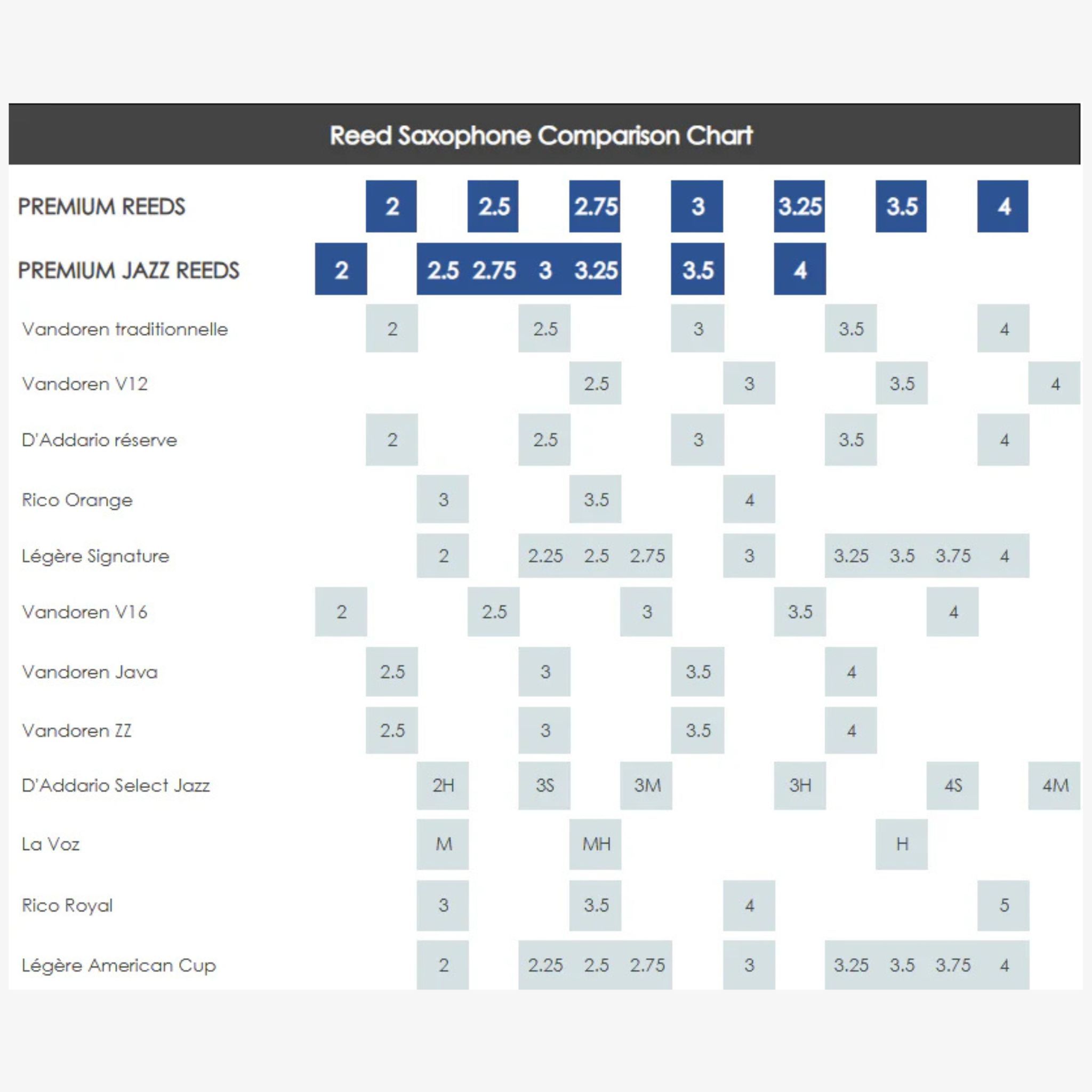 - These reeds are available in strengths 2 to 4, and are calibrated by ¼ strength between 2.5 and 3.5 to reduce dispersion and so offer musicians a greater number of good reeds in the same box.