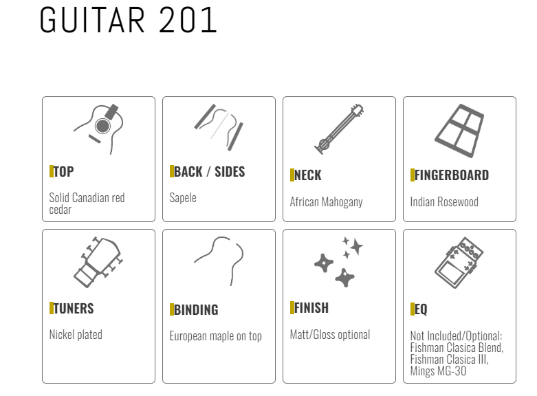 - EQ: Not Included/Optional: Fishman Clasica Blend, Fishman Clasica III, Mings MG-30