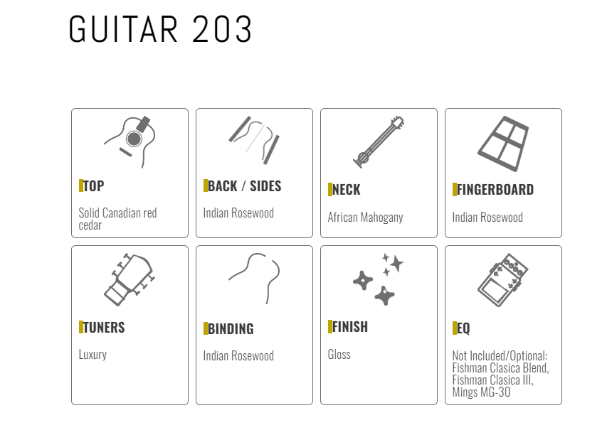 - EQ: Not Included/Optional: Fishman Clasica Blend, Fishman Clasica III, Mings MG-30